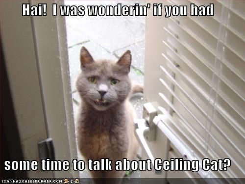 How dare you scoff at Ceiling Cat! You’ll have a matching set of busted shoulders if you keep it up, courtesy of Tunch tripping you at an appropriate time. Near stairs and/or concrete.