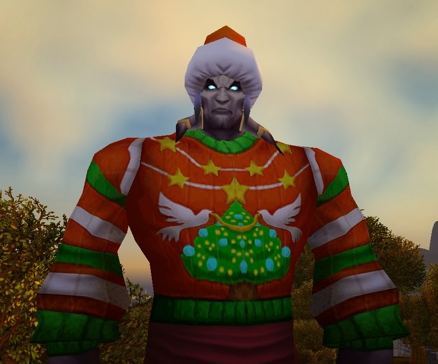 For (the majority) of y’all who don’t play WoW, there is an annual holiday event at Xmas/New Year (named Winter Veil in game), and one of the items available is a Gaudy Winter Veil Sweater.