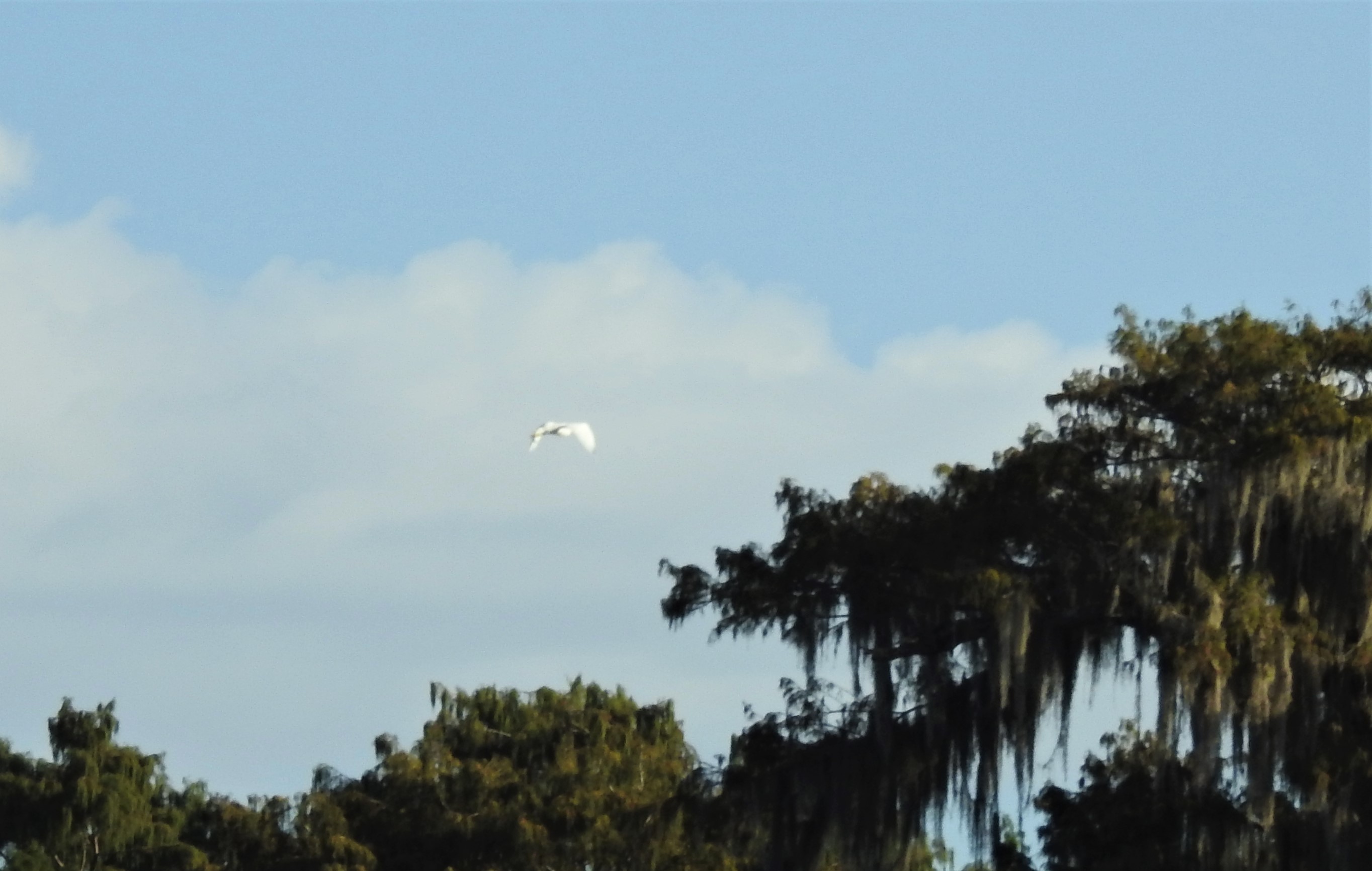 Here’s a blurry-ass photo of an egret in flight. It’s not a great picture of the bird, but I think the overall composition is accidentally pleasing, what with the puffy clouds and moss-laden trees: