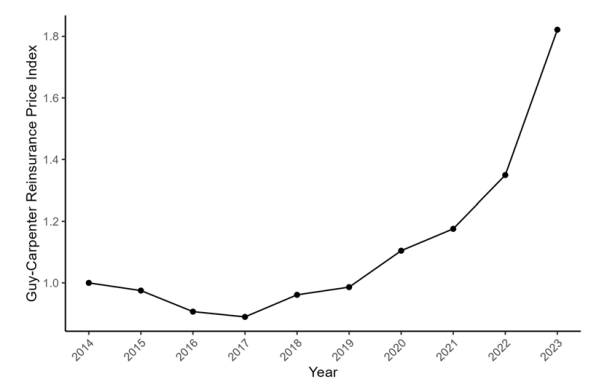 Earlier this month, Keys and Mulder released a new NBER working paper that builds a new property insurance data set and then seeks to project where premiums are likely to increase over time due to catastrophic claims risk. Catastrophic claims are routinely insured via reinsurance. For property damage, the major risk is storm and natural disasters risk. It is mostly fire and hurricane risk.