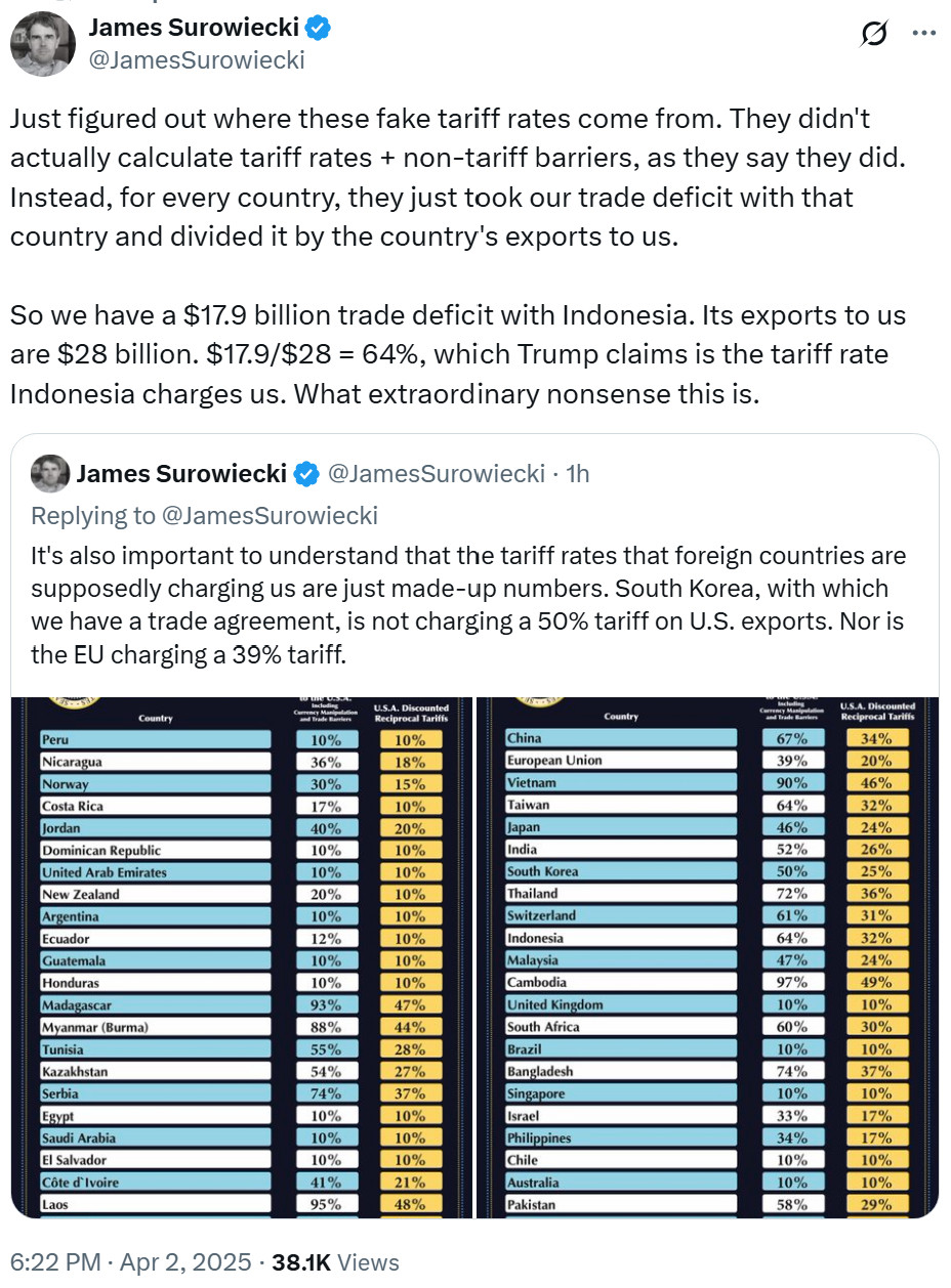 James Surowiecki: “Just figured out where these fake tariff rates come from. They didn’t actually calculate tariff rates + non-tariff barriers, as they say they did. Instead, for every country, they just took our trade deficit with that country and divided it by the country’s exports to us. So we have a $17.9 billion trade deficit with Indonesia. Its exports to us are $28 billion. $17.9/$28 = 64%, which Trump claims is the tariff rate Indonesia charges us. What extraordinary nonsense this is.”
