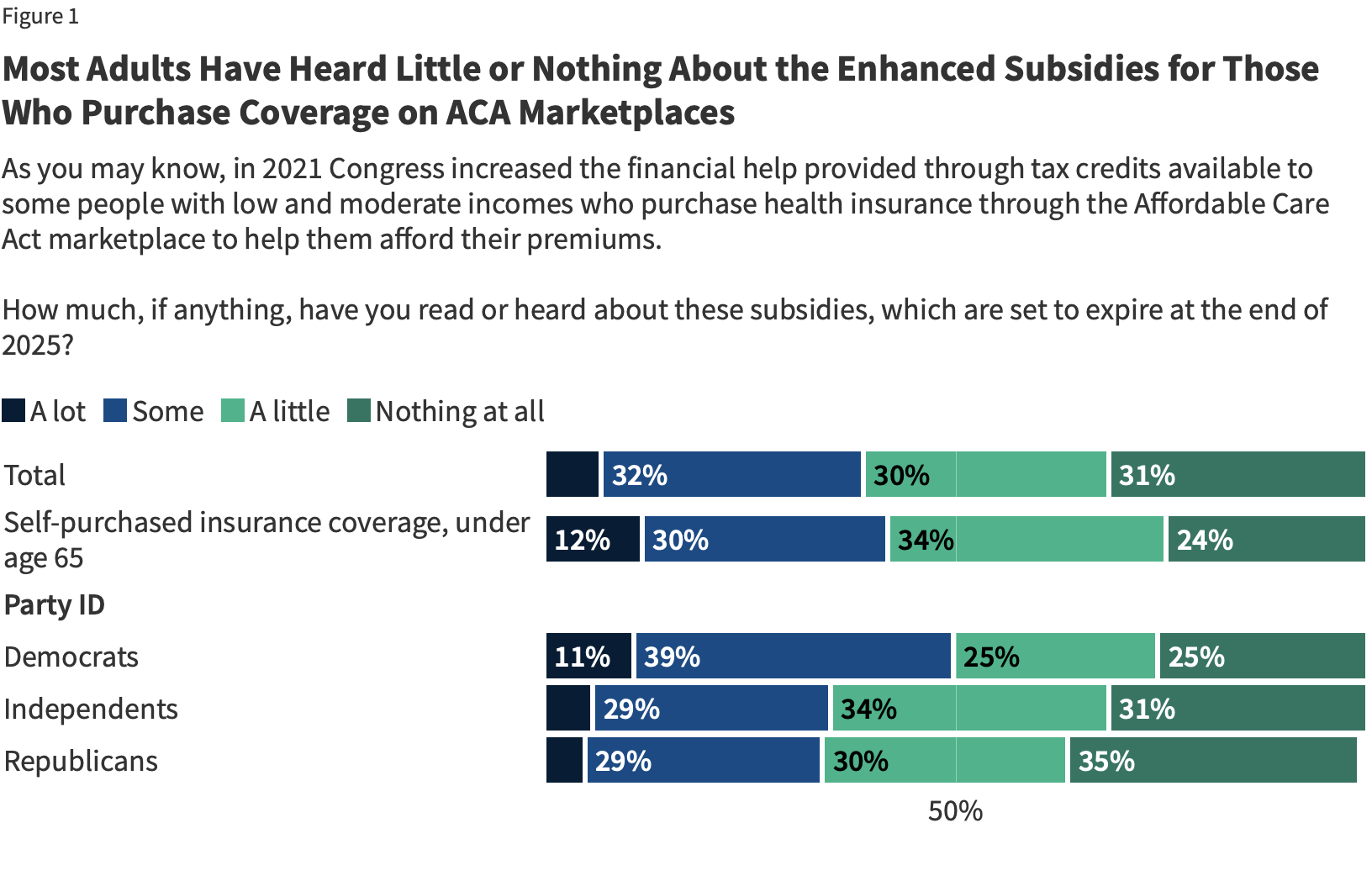 Majorities across partisanship also report that they would be concerned if they heard about something of the outcomes for both letting the tax credits expire, as well as if Congress extended the tax cuts – granted to a lesser degree. Majorities say they would be concerned if they heard that health insurance would be unaffordable for many people who buy their own coverage (86%), that 4 million people would lose their health insurance coverage (86%), or if they heard that people who work at small businesses or are self-employed would be directly impacted (85%). On the other side, if Congress does extend these enhanced tax credits, two-thirds of the public (63%) say they would be concerned if they heard that it would require significant federal spending that would be largely paid for by taxpayers.