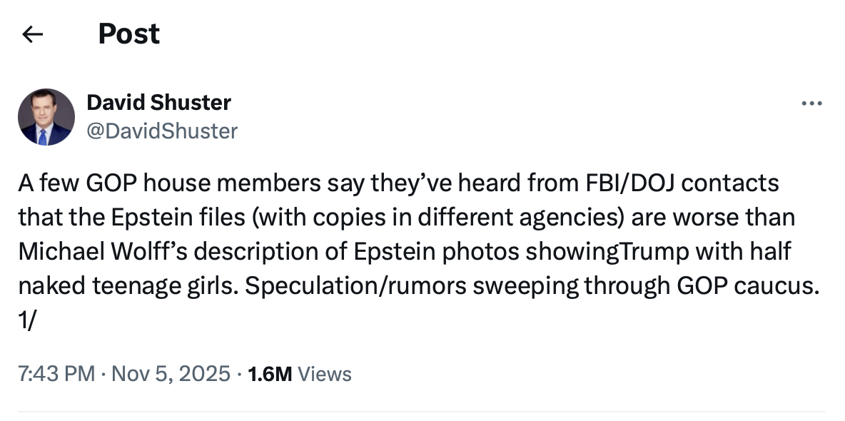 Trump has shut down the entire US government in order to avoid a vote in the House to release these files. The fact that that’s not now the dominant narrative in the MSM right now is a testimony to their utter uselessness. Whatever is in those files must be insane.