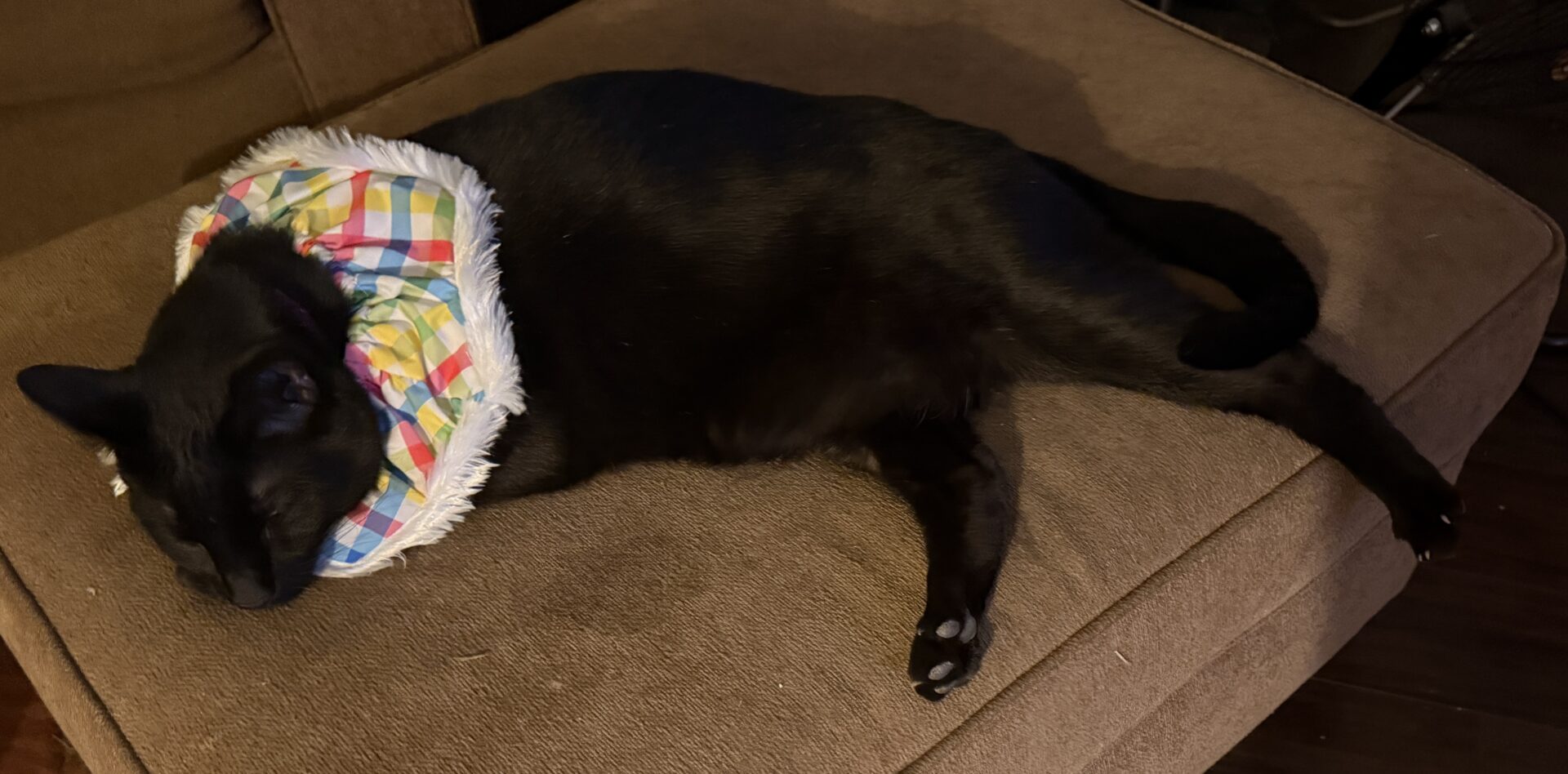 Maxwell looks adorable in his… ruff? Elizabethan collar? cravat? If he likes to wear it, more power to him. I’ve known dogs to who loved to “dress up,” and I have seen photos of kitties who seem pleased to be wearing clothes, but have never known one in person.