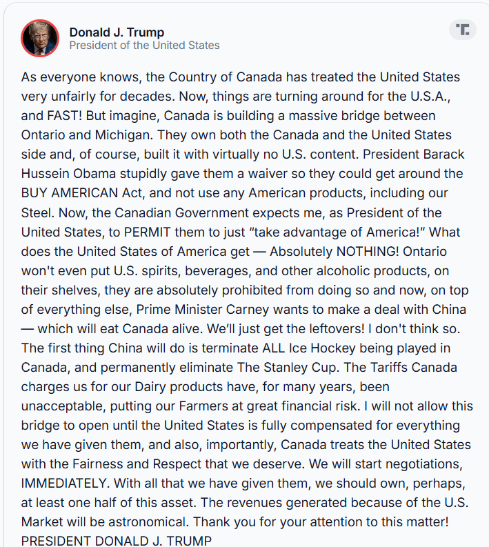 i have no idea what he’s going on about in regards to Canada. OK, so they are building a bridge. He is tariff’ing Canadian products, they don’t have to give him squat. Nobody owes the U.S. any markets.