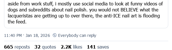 — Cold vermin winter of our discontent (@sciencehippies.bsky.social) January 20, 2026 at 7:45 PM
