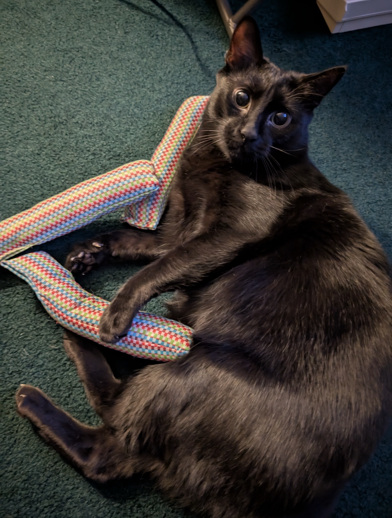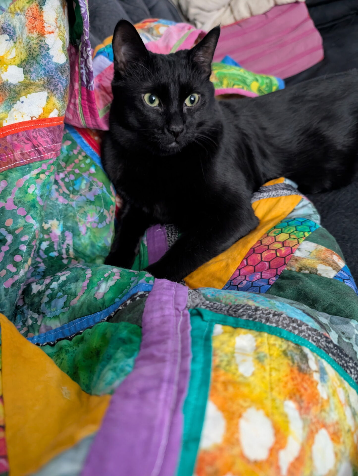 Several months ago, I completed my first quilt. It is substantially imperfect by any measure, but I am delighted with it. A friend calls it a physical expression of endorphins and she’s right. I included a picture of it in action because it pretty much captures my overall vibe–lots of color and fun patterns. Additionally, I engaged with the Japanese concept of kintsugi and went bold with my patches and repairs.