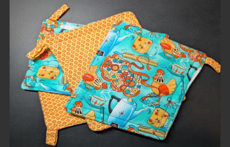 Atomic chicken pattern small potholders–good for young cooks and small spaces