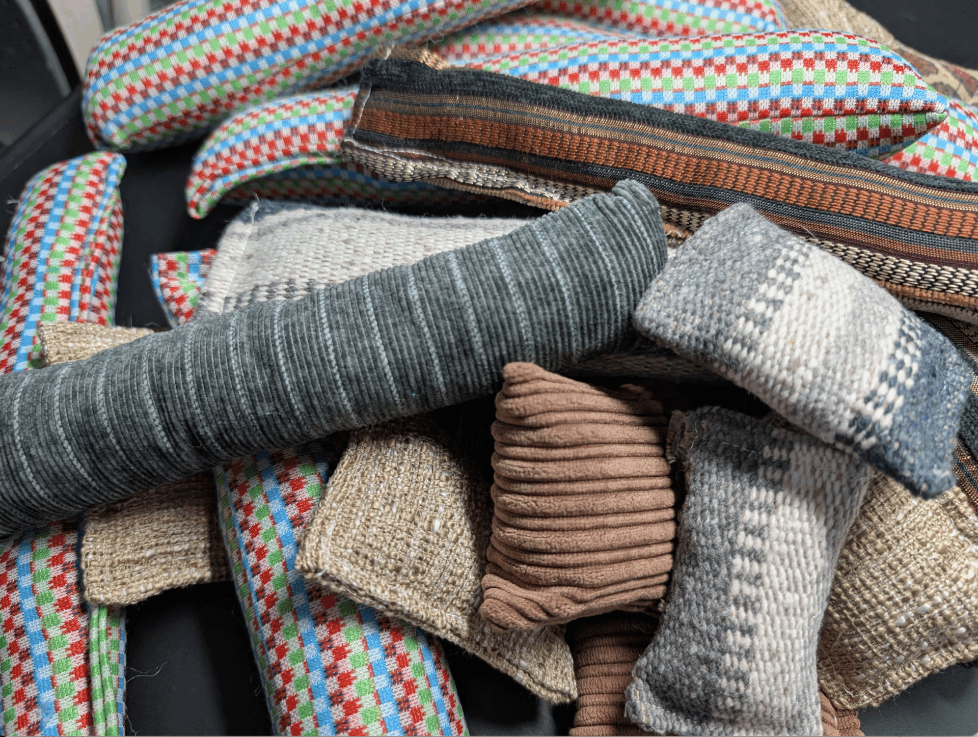 Pile of cat toys. I stuff them with a mix of yarn, fabric scraps, wool roving, and synthetic fluff. The variations in texture are irresistible to the cats