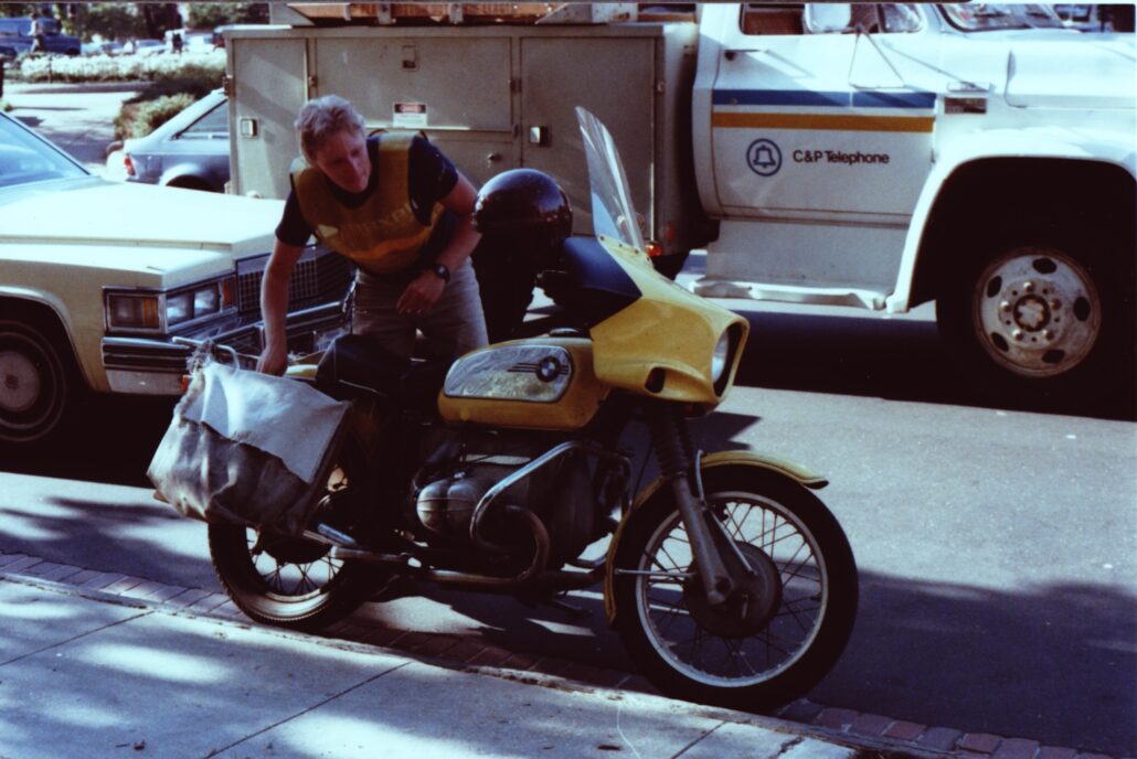 I was ready for another break and started checking the help wanted ads in the Washington Post (a real paper in those days). I couldn’t help noticing the several columns of ads for messengers—car, motorcycle and bicycle. The pay seemed great (later I would realize that those were the absolute top amounts that could possibly be earned by a great messenger who had a lucky week) and the ads offered flexible hours and no experience needed. I had been seriously riding and fixing bicycles since I was about 14 so that seemed like a job I could do well at—but for reasons that I can’t explain today outside of a sense of adventure and self-confidence gained by living in New Orleans, I decided I would become not a bicycle but a motorcycle messenger.